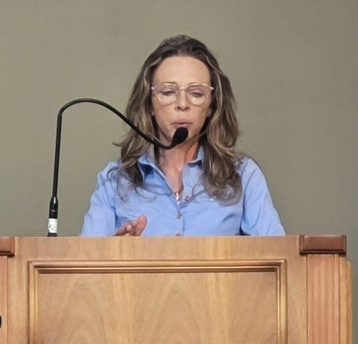 Vereadora Marisa Schwarzer (PSDB) na tribuna da Câmara hoje pela manhã. Falou que sofre violência política de gênero, pressões e outros comportamentos. Comentou o encaminhamento de Mandado de…