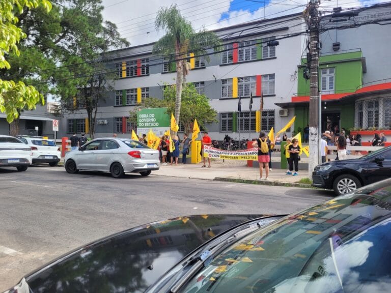 Pequeno grupo de professores e servidores aposentados do Cpers/Sindicato esperam o governador Eduardo Leite (PSD) em frente ao prédio do Instituto de Educação Assis Brasil. Com uma faixa…