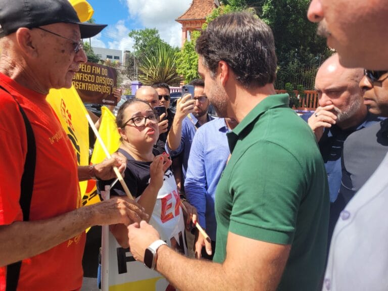 Governador Eduardo Leite (PSD) já está no Assis Brasil. Participa das inauguração das obras feitas no educandário. Na calçada, foi recebido por cerca de 30 representantes do Cpers…