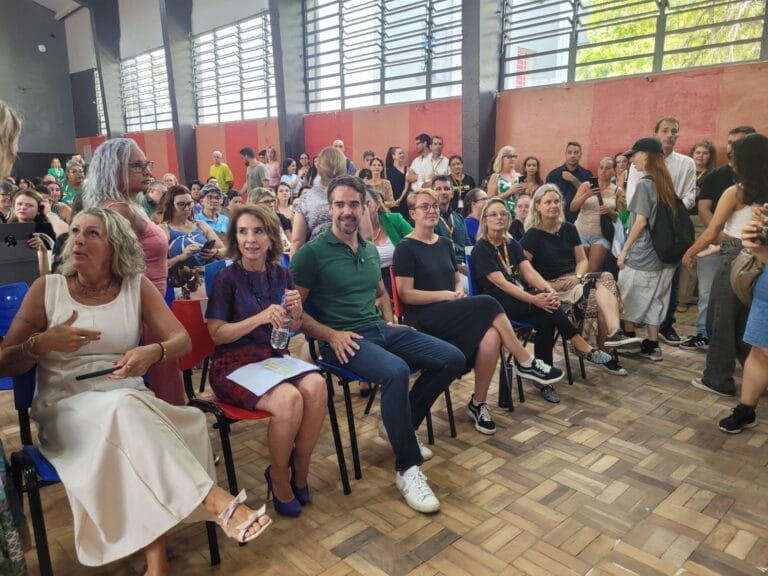 Iniciada a solenidade de entrega das obras no Assis Brasil. Neste momento fala a diretora Rosangela Rschinhas. Presenças, além de Eduardo Leite, das secretárias de Educação, Raquel Teixeira…
