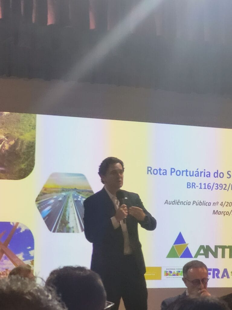 Iniciada a audiência pública da Rota Portuária do Sul. Neste momento, Marcelo Fonseca, superintendente de Infraestrutura apresenta a proposta do novo sistema.