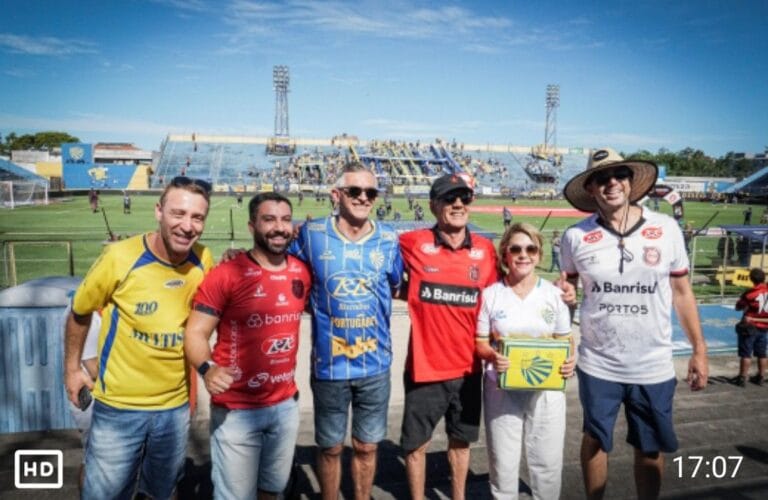 Torcida mista no Bra-Pel. Entre os presentes, o jornalista César, o vereador Antônio Peixoto, o secretário Luiz Henrique Viana, o prefeito Fernando Marroni, a vereadora/secretária Míriam Marroni e o deputado federal Daniel Trzeciak.