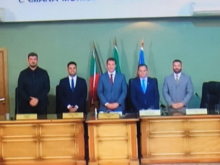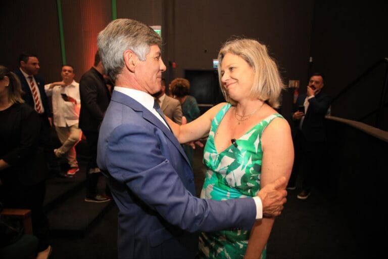 Com a formação da mesa que dirigirá a sessão de posse, o prefeito Fernando Marroni(PT) e a vice- prefeita Daniela Brizolara(PSoL) foram conduzidos ao palco por representantes da diversidade social. Citadas as autoridades presentes, é executado o Hino Nacional.