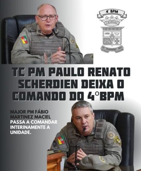 Mudança no comando do 4′ Batalhão de Polícia Militar (4′ BPM) da Brigada Militar. Sai o Tenente-Coronel PM Paulo Renato Scherdien e assume o comando o Major PM Fábio Martinez Maciel. Scherdien passa a integrar a equipe da 4ª Coordenadoria…