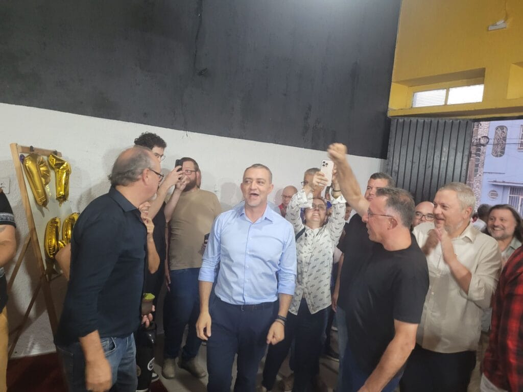 Edegar Pretto, pré-candidato do PT ao governo do estado, chega às 19h05min para a inauguração da nova sede do partido.
