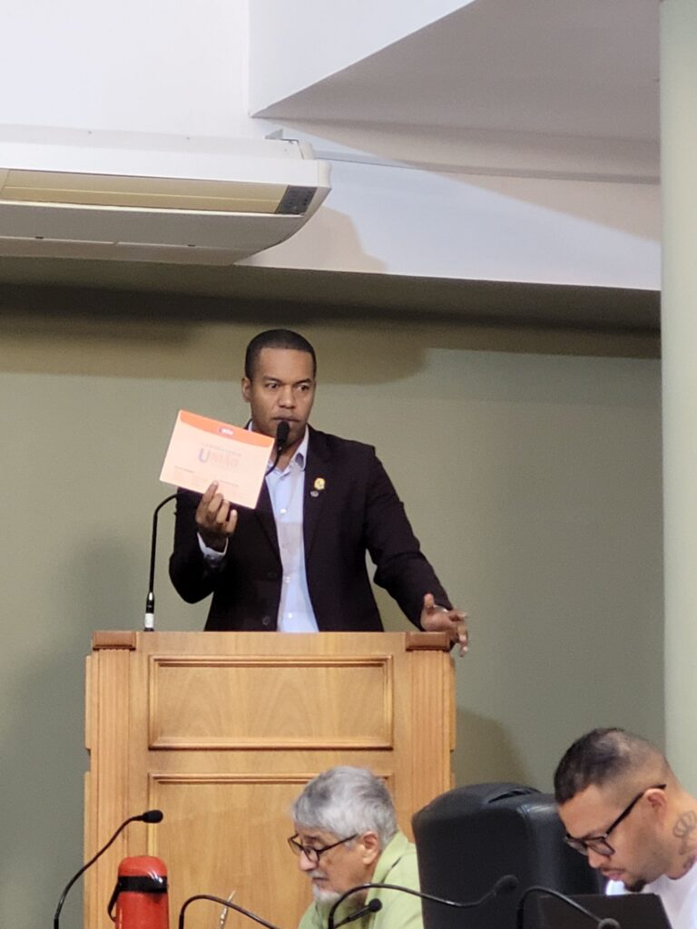 Na tribuna, vereador César Brizolara (PSB) comenta manifestação da vereadora Fernanda Miranda (PSoL) sobre a realização de exames toxicológicos por parte dos vereadores.
