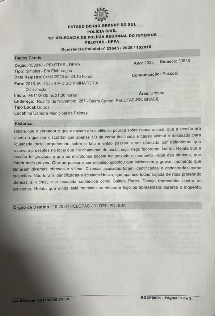 Às 23h26min o cidadão Michel Escalante fez o registro da Ocorrência Policial n’ 33645 / 2025 / 152010. Fato; 2015.16 – Injúria Discriminatoria (consumado).