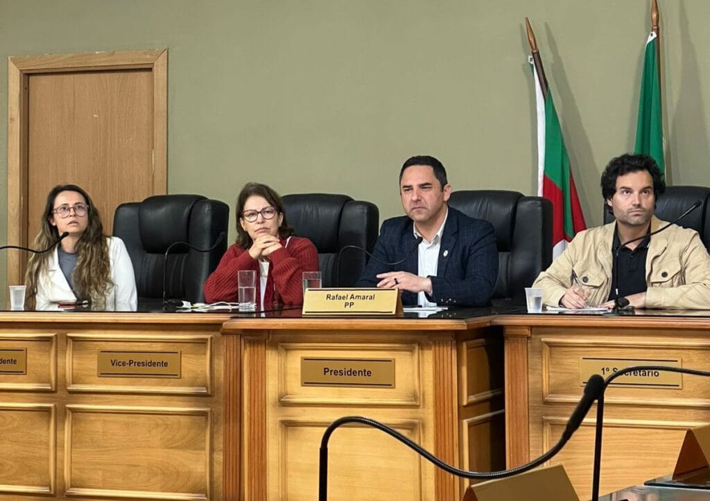 Em andamento na Câmara de Pelotas, reunião da Comissão de Saúde, presidida pelo vereador Rafael Amaral (PP).