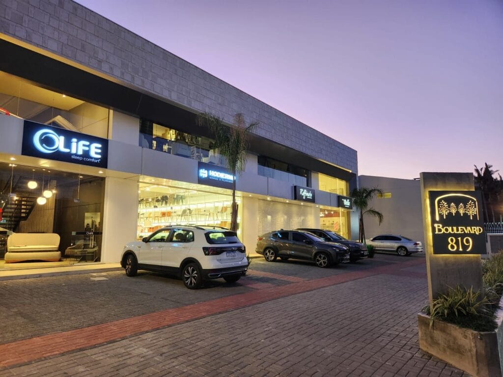 Integram o novo espaço as lojas Life Colchões, Hodierno Móveis e Planejados, Raffinato Acabamentos e Madame Belle Cama, Mesa e Banho.