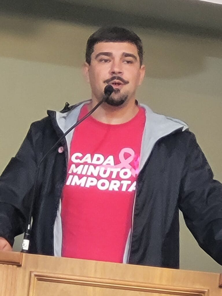 Vereador Tauã Ney (PSDB) fala na tribuna da Câmara neste momento. Discorre sobre o Outubro Rosa e a conscientização sobre o Câncer de Mama.