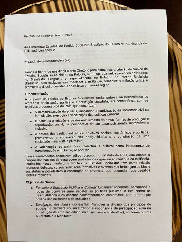 Está criado na estrutura do Partido Socialista Brasileiro (PSB) em Pelotas, o Núcleo de Estudos Socialistas.
