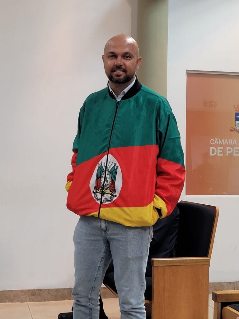 Vereador Júnior Fox (PL) entra no plenário da Câmara. Com um impermeável com as cores da bandeira do Rio Grande do Sul. Tanto na frente como nas costas,…